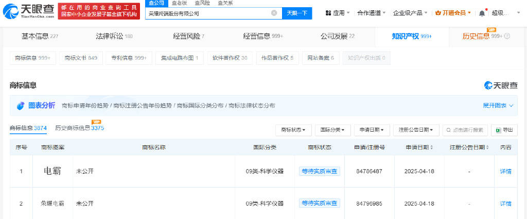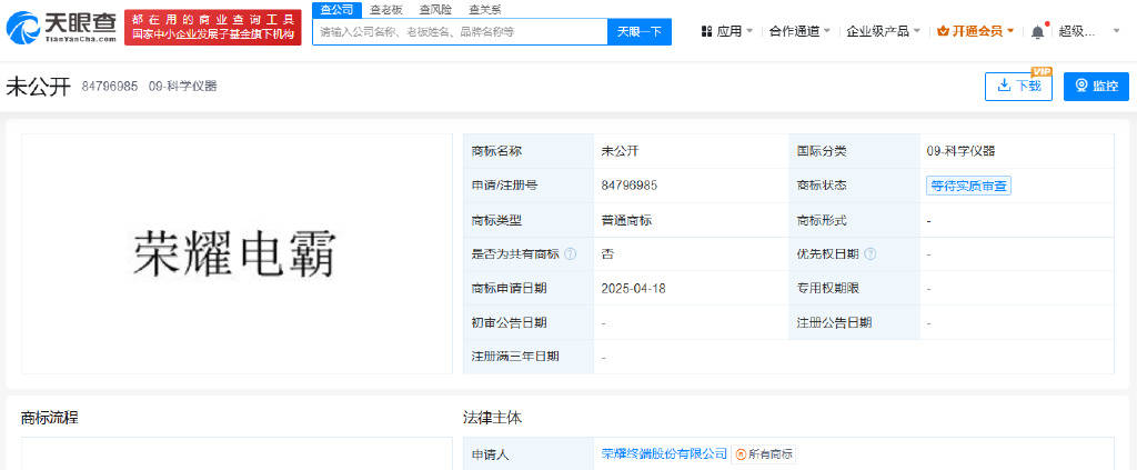 天眼查知识产权信息显示,近日,荣耀终端股份有限公司申请注册“电霸”“荣耀电霸”商标,国际分类为科学仪器,当前商标状态为等待实质审查。