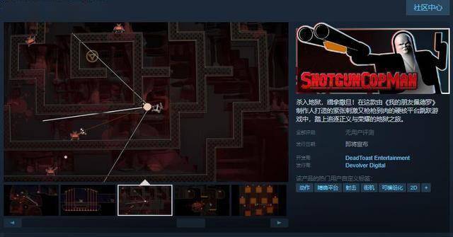 今日(2月22日),硬核平台跳跃游戏《Shotgun Cop Man》Steam页面上线,游戏支持简繁体中文,发售日待定,感兴趣的玩家可以进入商店页面。