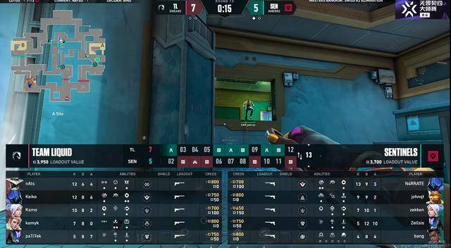 下半场TL打A赢下手枪局拿到赛点,第14回合TL打B安包,SEN回防出烟被打掉,TL 13-1赢下源工重镇。