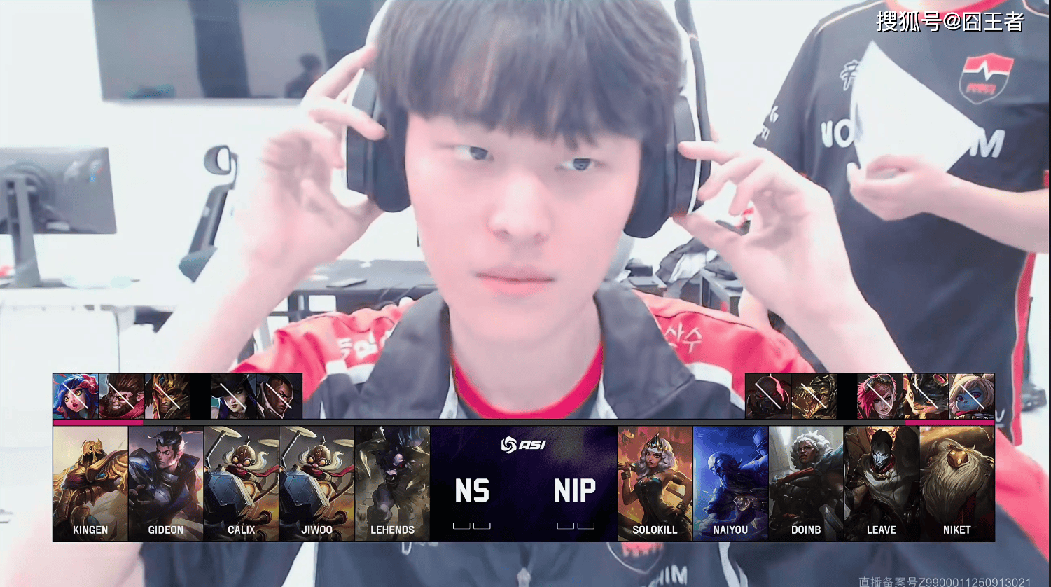 第一局比赛,NS蓝色方,禁用:妮蔻、猴子、皇子、女警、卢锡安,选用:Kingen挖掘机、GIDEON赵信、Calix沙皇、Jiwoo飞机、Lehends牛头;NIP红色方,禁用:波比、兰博、蔚、鳄鱼、赛恩,选用:Solokill安蓓萨、naiyou琪亚娜、Doinb瑞兹、Leave烬、Niket巴德