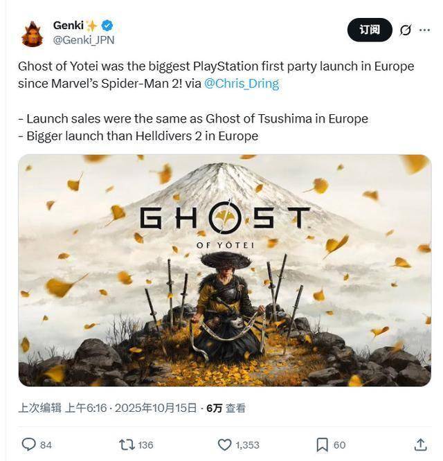 这意味着《羊蹄山之魂》的销量并没有超过《漫威蜘蛛侠2》,其欧洲地区的销量和前作《对马岛之鬼》的销量差不多。