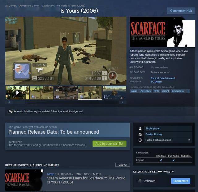 近日,基于1983年电影《疤面煞星》改编的2006年经典游戏《疤面煞星:掌握世界》在Steam和Epic游戏商店的重新发行计划遭遇了一系列意外,导致发行过程混乱,最终被暂时下架。
