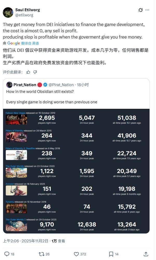 过去几年中,黑曜石接连推出了多个游戏,然而国外网友发现,黑曜石在现代回归之后,从他们2015年推出的首个游戏《永恒之柱》开始,Steam在线是一个不如一个。