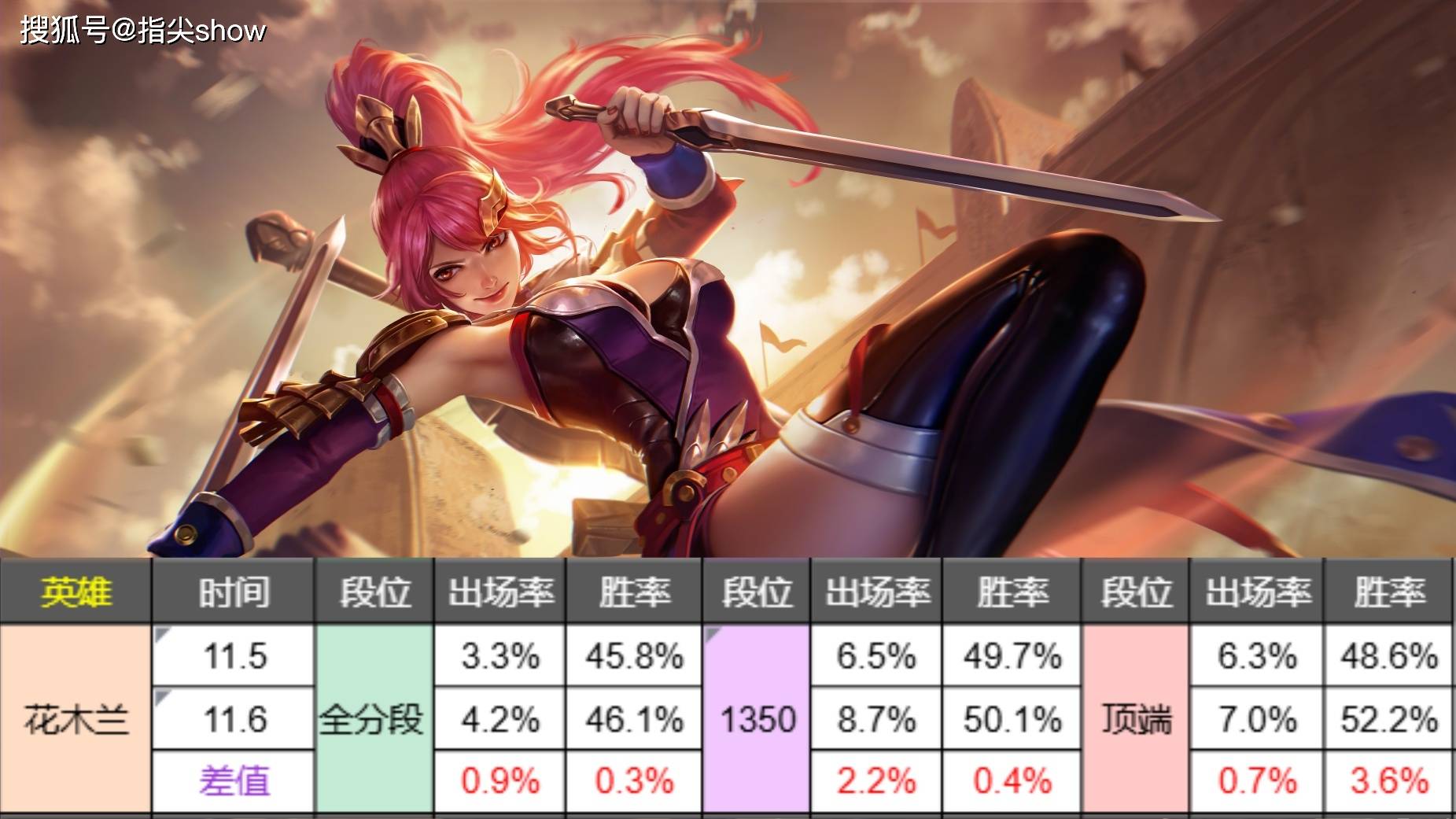 从无到有的机制称得上是史诗级的调整,花木兰在本次更新后,终于迎来了心心念念的续航,虽然不多,但至少也是“人有我有”了,而前期大招多加的30点伤害其实也在发力,以至于顶端巅峰赛中,胜率涨了3.6%,不过出场率只是微微上涨。