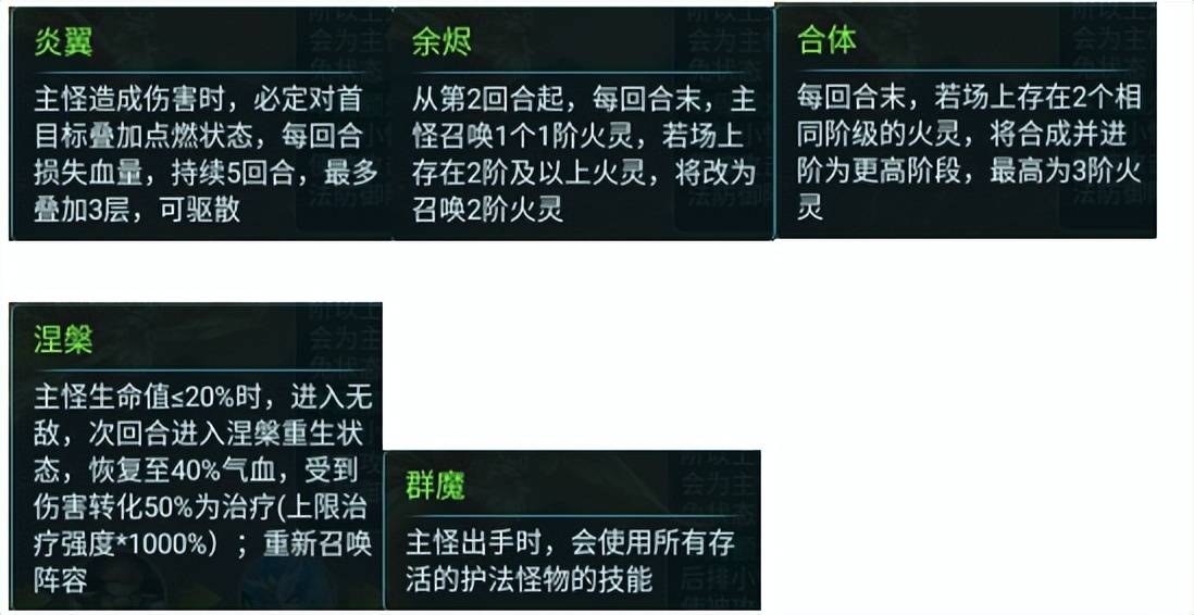 同样需要大家注意的是,每回合初,2阶以上的火灵(及烈煞)会为主怪附加伤害减免。而后排小怪则概率使被攻击的首目标物法防御降低。