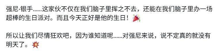 "强尼·银手…这家伙不仅赖在你脑子里不付房租,还能随时搞起狂欢派对。今天正好是他的生日!让我们尽情放纵,仿佛明天不会到来——毕竟有强尼在,明天说不定真的不会到来!"