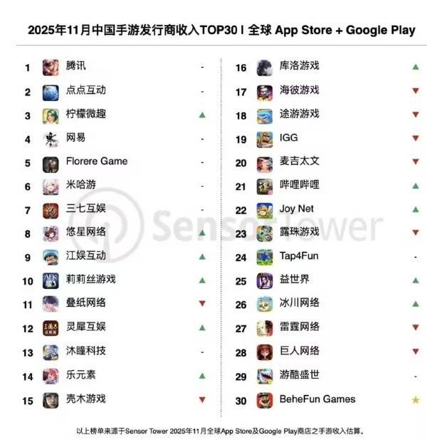 【CNMO科技消息】12月8日,Sensor Tower发布了2025年11月手游发行商全球收入排行榜(App Store+谷歌商店)及App Store手游收入排行榜。数据显示,腾讯、点点互动、柠檬微趣位列发行商收入前三甲,网易游戏仅排名第四,共有33家中国厂商进入前100。而《王者荣耀》《三角洲行动》《金铲铲之战》则占据App Store手游收入榜单前三席。
