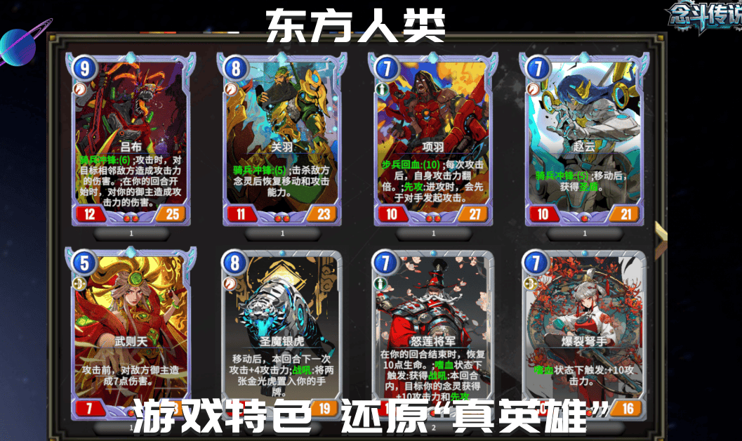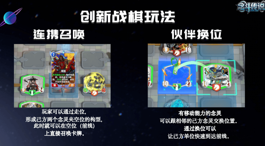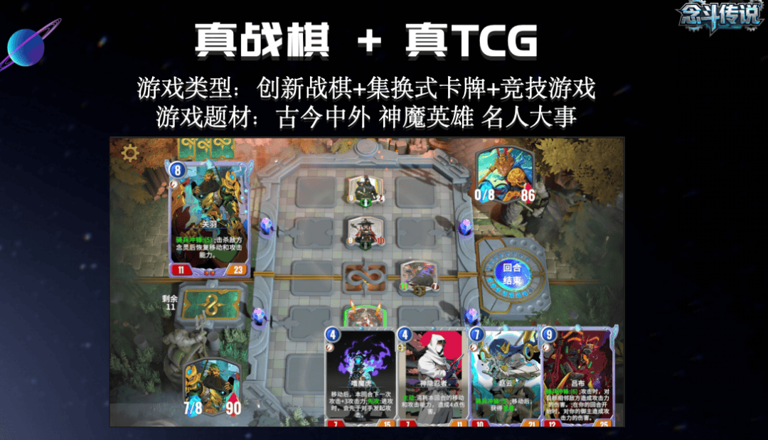 《念斗传说》是一款创新战棋卡牌游戏,其核心特色在于深度融合战棋的走位策略与TCG的卡牌构筑,采用3×5紧凑战场,强调棋子推进与战术卡位,而非简单数值交换。游戏设计了基于历史/神话人物的特色英雄技能,并引入“连续召唤”“伙伴换位”等机制增强策略维度。