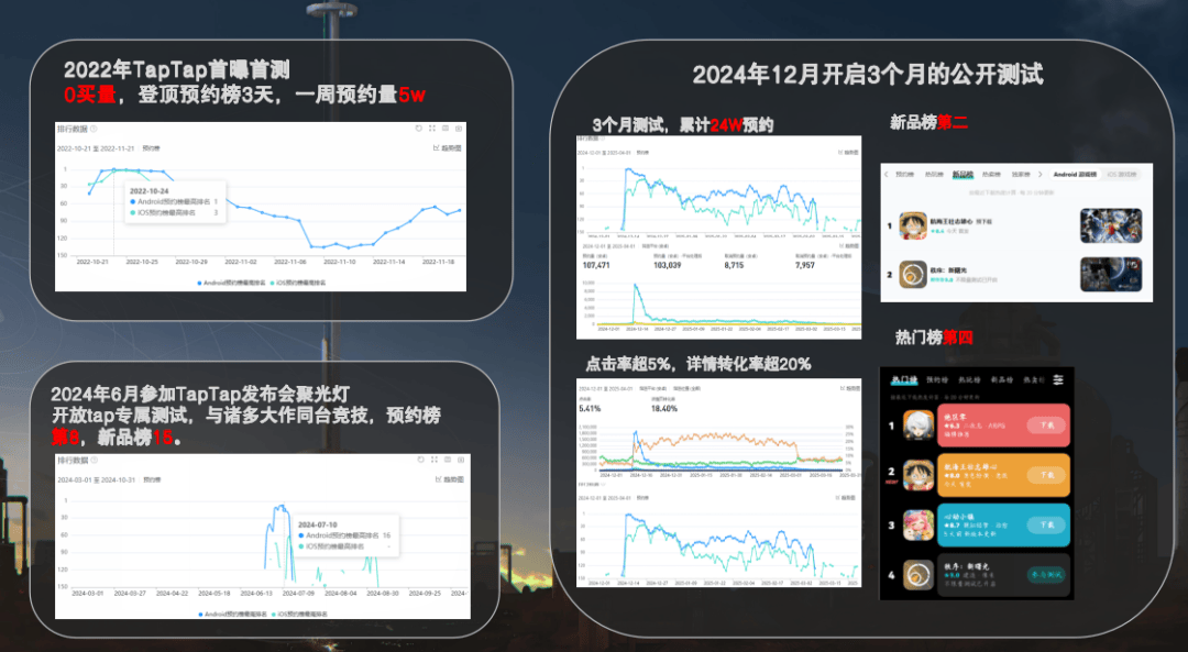 据悉,该游戏研发历时已超五年,期间共进行过两次双端测试与两次大规模手机端测试,计划于今年年底上线抢先体验( EA)版本,并于2026年陆续实现自定义副本、创意工坊支持及正式版发布。在2024年12月开启的为期三个月的公开测试中,游戏累计预约量突破24万,曾登上TapTap新品榜第二位,测试期间点击率超过5%,详情页转化率亦高于20%,显示出较强的玩家关注与期待。