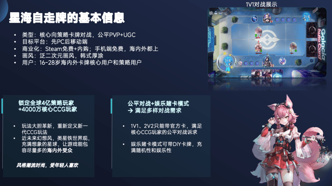 据悉,该游戏团队核心成员拥有腾讯、育碧等公司经验,并具备AI技术背景。目前游戏已进行多次测试,其中于2024年7月底测试的次日留存达41.86%,周留存达17.83%。两周测试时间,平均DAU/注册用户=23/129;首周平均每日在线时长>50分钟。目前团队正在寻求融资以致力于打造全球首款卡牌对战UGC平台。