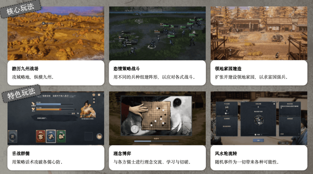 从展示内容可见,当前游戏创业团队属性日趋多样化。部分团队专注于相对蓝海或尚未形成竞争的“孤品”赛道,例如秦川汉渚工作室推出的《华夏史诗:战国》,即瞄准 “类骑砍”开放世界+SLG稀缺市场。