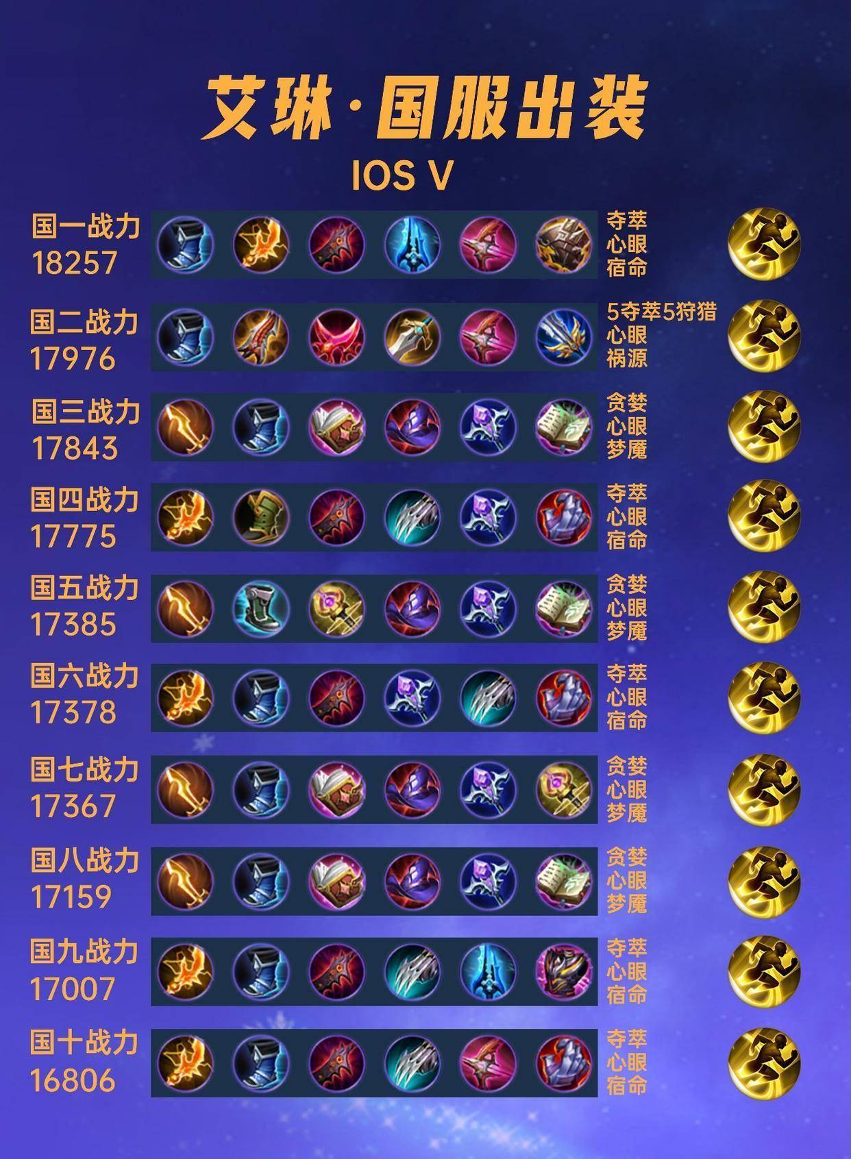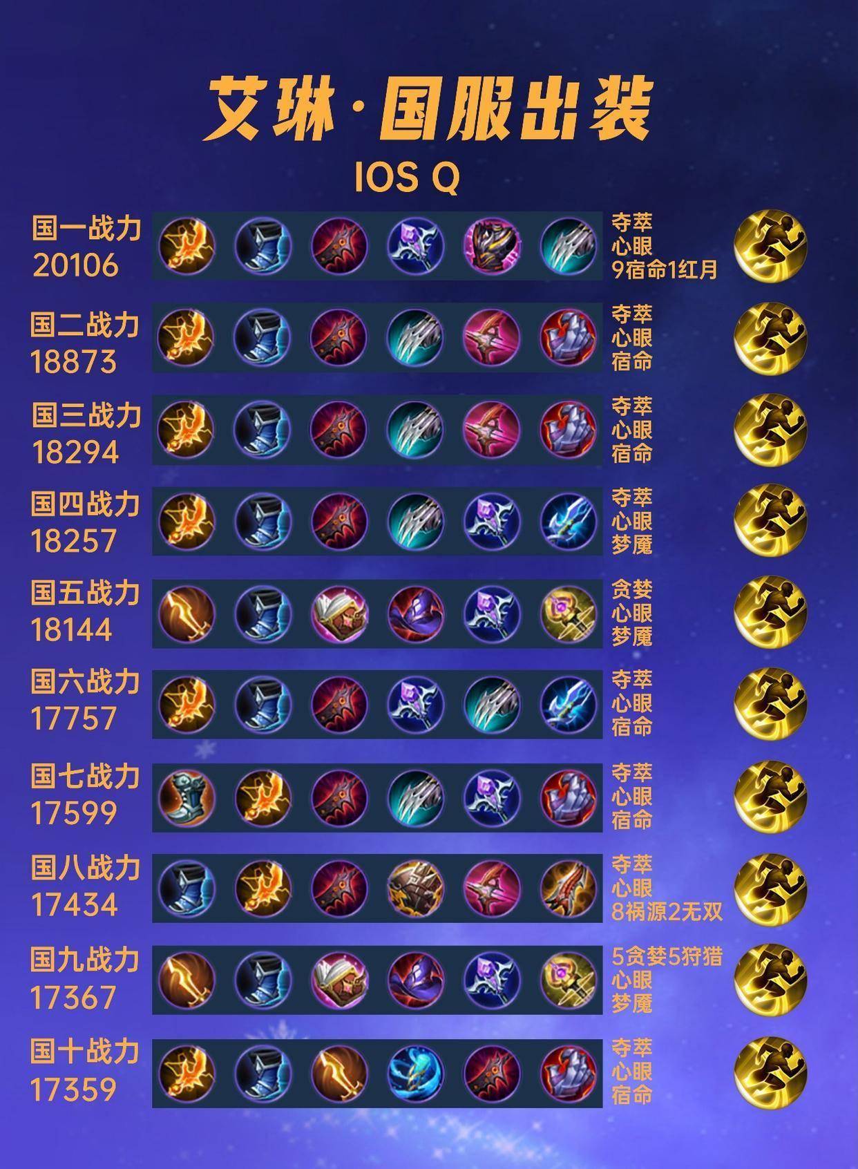 这一篇文章我们来看一下40位国服艾琳的出装铭文汇总。