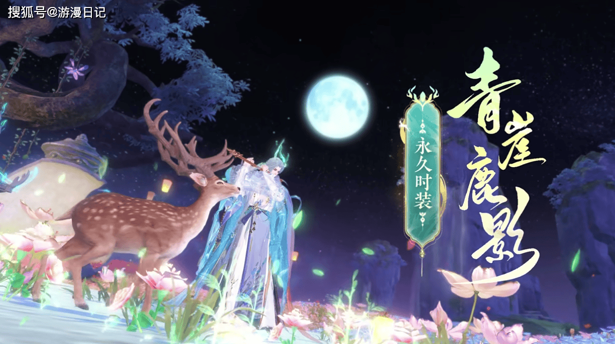 男款采用月白与暗蓝为主调,挺拔剪裁勾勒出俊逸身姿,腰间铜铃随步伐轻响,蓝晶鹿角如冰晶分叉生长,既显仙气又不失侠客的洒脱。