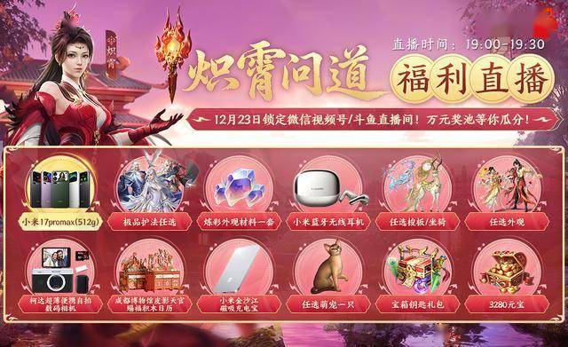 “炽霄问道”资料片嘉年华开启,各位少侠不仅可以在游戏内参与新版本各项活动,也可以在【炽霄问道直播盛典】抽取多重豪华大奖!参与游戏内日常活动,可轻松获得集字活动兑换材料,集齐后兑换好礼有机会获得直播抽奖券、护法招募券、红包兑换等。拥有抽奖券的少侠可参与12月23日晚官方直播间活动,小米17pro max、小米无线耳机Buds 5 Pro、柯达超薄便携相机、成都博物馆皮影积木日历、小米金沙江磁吸充电宝、任选在售外观等绝品大礼等你抽取!