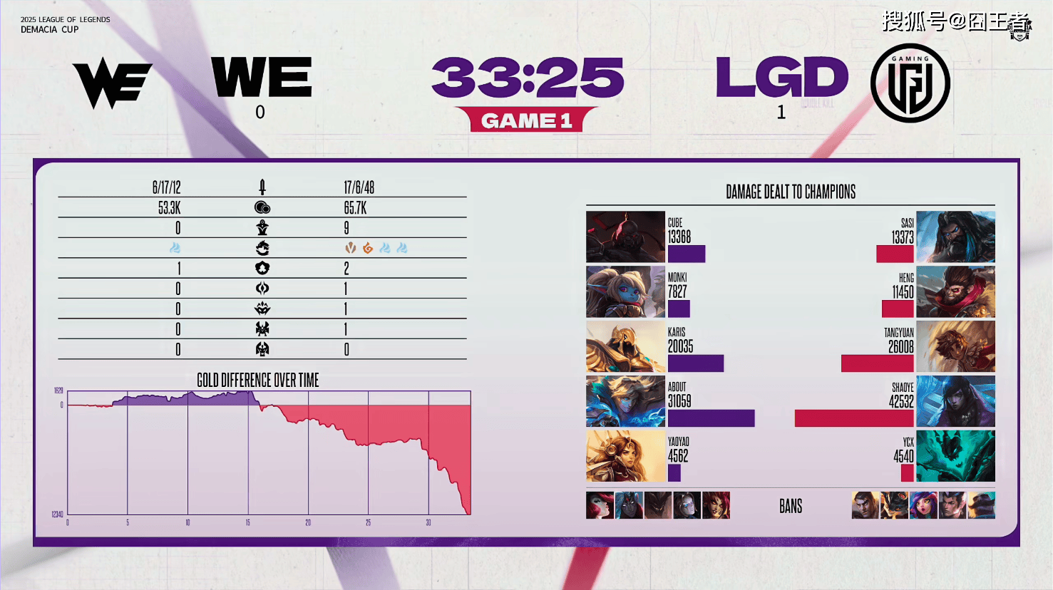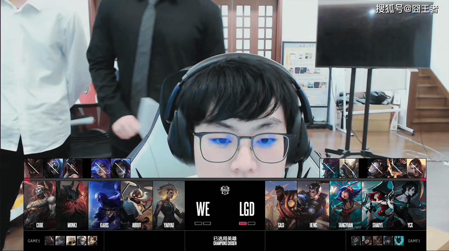第一局比赛,WE蓝色方,禁用:婕拉、发条、石头人、韦鲁斯、女枪,选用:Cube赛恩、Monki波比、Karis沙皇、About伊泽瑞尔、yaoyao蕾欧娜;LGD红色方,禁用:杰斯、兰博、妮蔻、赵信、布隆,选用:sasi乌迪尔、Heng猴子、Tangyuan岩雀、Shaoye厄斐琉斯、Ycx锤石