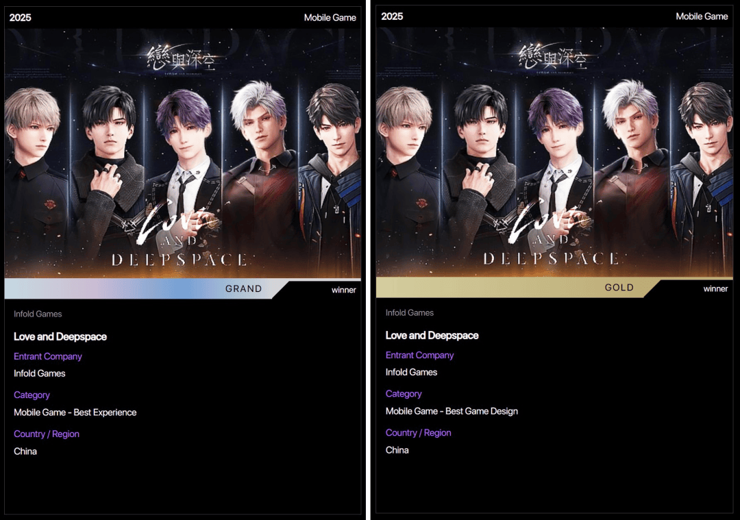 而市场的反应、业界的选择,已经证实了:全球玩家对陪伴感的追求,被忽视了太久——仅说2025年,《恋与深空》就在上斩获了最佳移动游戏奖项,并在NYX Game Awards中斩获了移动游戏最佳体验大奖、最佳游戏设计金奖,实现了「全球热恋,顶峰相见」;
