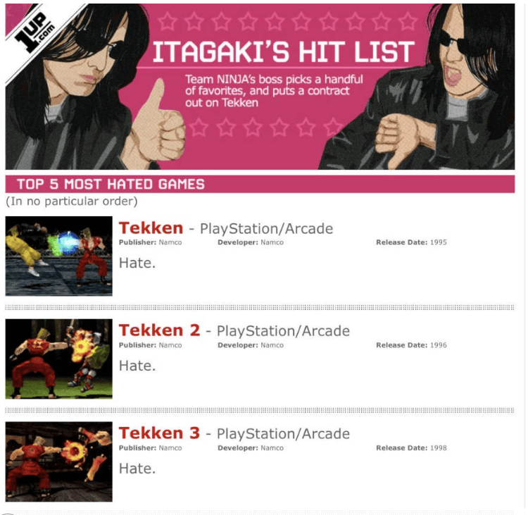 但其实,游戏制作人并非一直这样。《鬼泣》《猎天使魔女》的制作人以喷人闻名,《忍者龙剑传》和《死或生》的制作人板垣伴信直球告诉媒体,自己最讨厌的5个游戏是《铁拳5》《铁拳4》《铁拳3》《铁拳2》和《铁拳》。