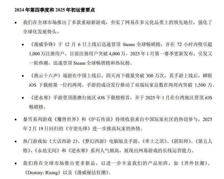 根据财报信息显示,网易去年在全球市场推出了多款重磅新游,夯实了网易在多元化品类的领先地位,强化了全球发展的势头。