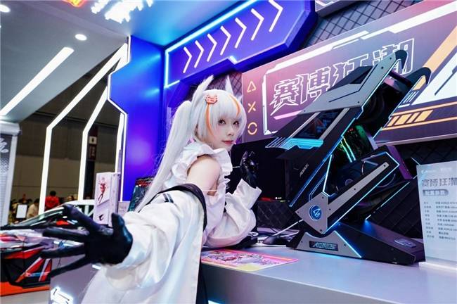 由AORUS B850M主板搭配技嘉破空C201机箱打造的耀白之境展区,萌萌的女仆雕妹忍不住和自己的次元形象近距离合影。就连前TEC.Blackovo也不能抗拒这样萌萌的硬件专区的吸引力。