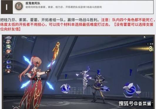 把桂乃芬、素裳、藿藿、开拓者组一队,赢得一场战斗胜利。注意:队内四个角色都不能死亡练度太低的开拓者不用担心,可以找个材料本选择最低难度打过去。