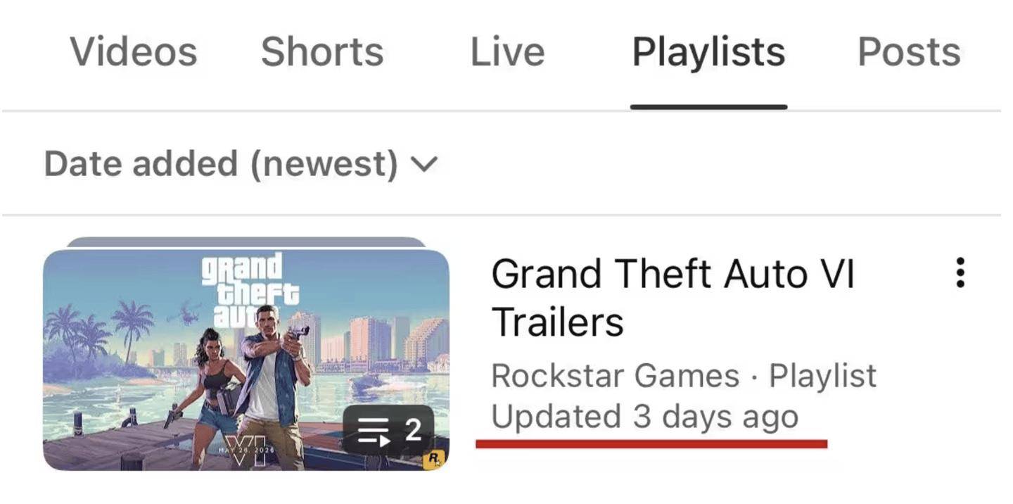 令人意外的是,该播放列表突然显示“三天前已更新”,尽管相关播放列表中的内容并未有任何实际改动,但网友推测 R 星可能已上传了第三部预告片,只是目前将其设为“私人”或“不公开”状态,相关预告片有望在近期正式设为“公开”。
