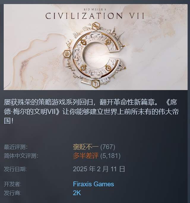 但像是“文明7”这个并不具备性价比的售价,再加上是大厂的经典系列续作,端上来一盘半成品自然被骂得更狠
