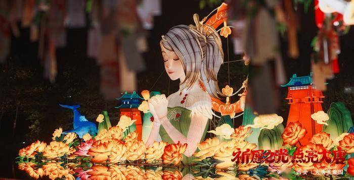 曲江池畔边也举办了一场送河灯仪式,来到线下的游客可以亲手在这里放送河灯、许下愿望,后来我了解到,线上玩家也可以留下自己的祝福,也有机会被定制印制成实体许愿签,系在河灯上。大部分签文上都是一些平淡、温馨和生活有关的许愿,反而有一种珍贵。