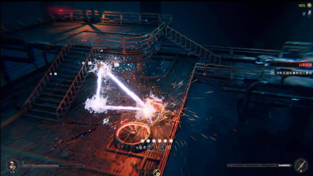 除此之外的第三个维度,则是“芯片”。它类似于其他肉鸽游戏中的“遗物”,可以在战局开始前进行装配,也会在游戏开始后由Boss敌人掉落,能为主角带来飞跃式的性能提升——甚至……有点过于飞跃了,例如其中有一个芯片的效果是“精准弹反时恢复一格资源”,直接补齐了基础性能中“资源回收”的短板,让玩家能直接打通“不断精防”到“战技连发”的循环。可以说,有这个芯片和没这个芯片,完全是两个游戏难度。