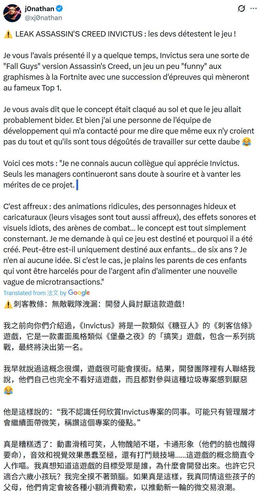j0nathan 随后透露,这款游戏存在“荒谬的动画、丑陋又卡通化的角色、愚蠢的音效和视觉特效 / 竞技场设计”,并质疑起游戏受众。他甚至揣测,这款游戏的目标群体或许并非《刺客信条》粉丝,而是六岁小孩。