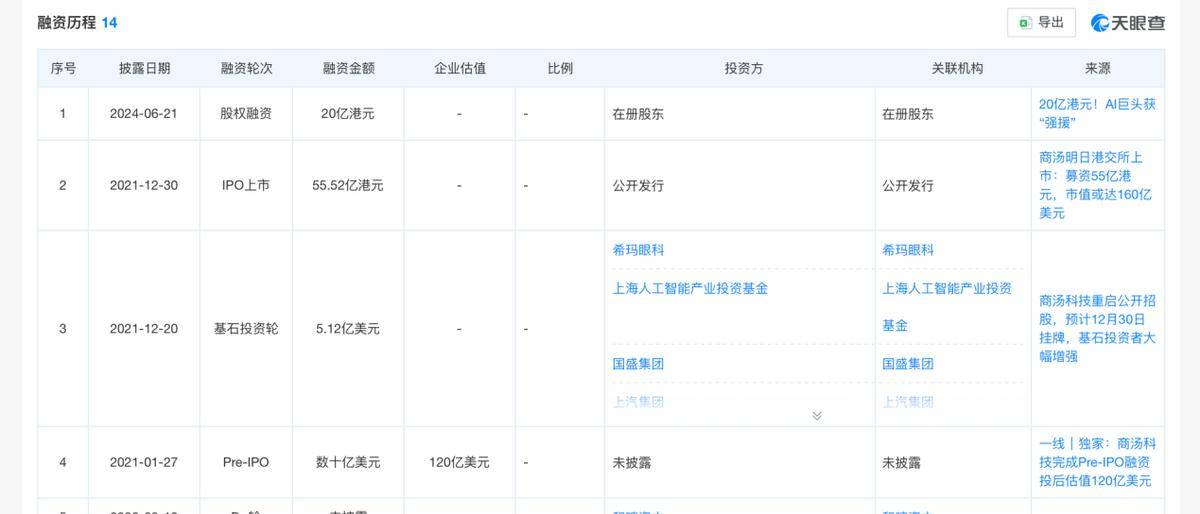 天眼查APP显示,不完全统计,如果算上IPO,那么商汤科技至少有过9轮融资。