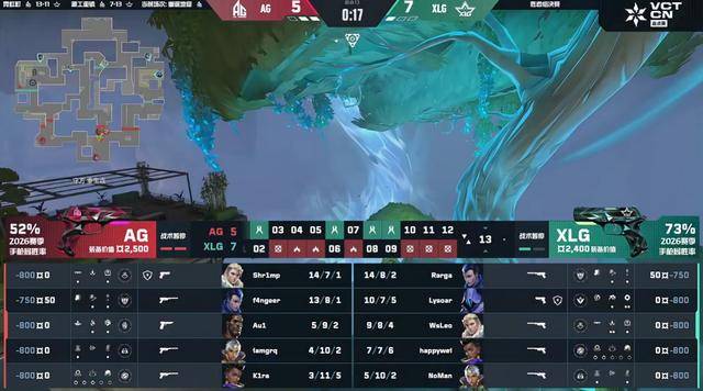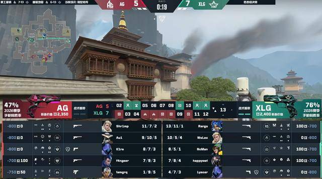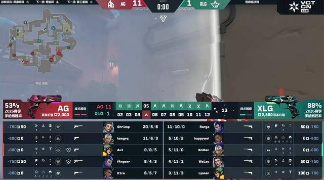 上半场AG打出四连胜。第5回合XLG声东击西,控中打B成功打掉AG的防守赢下。