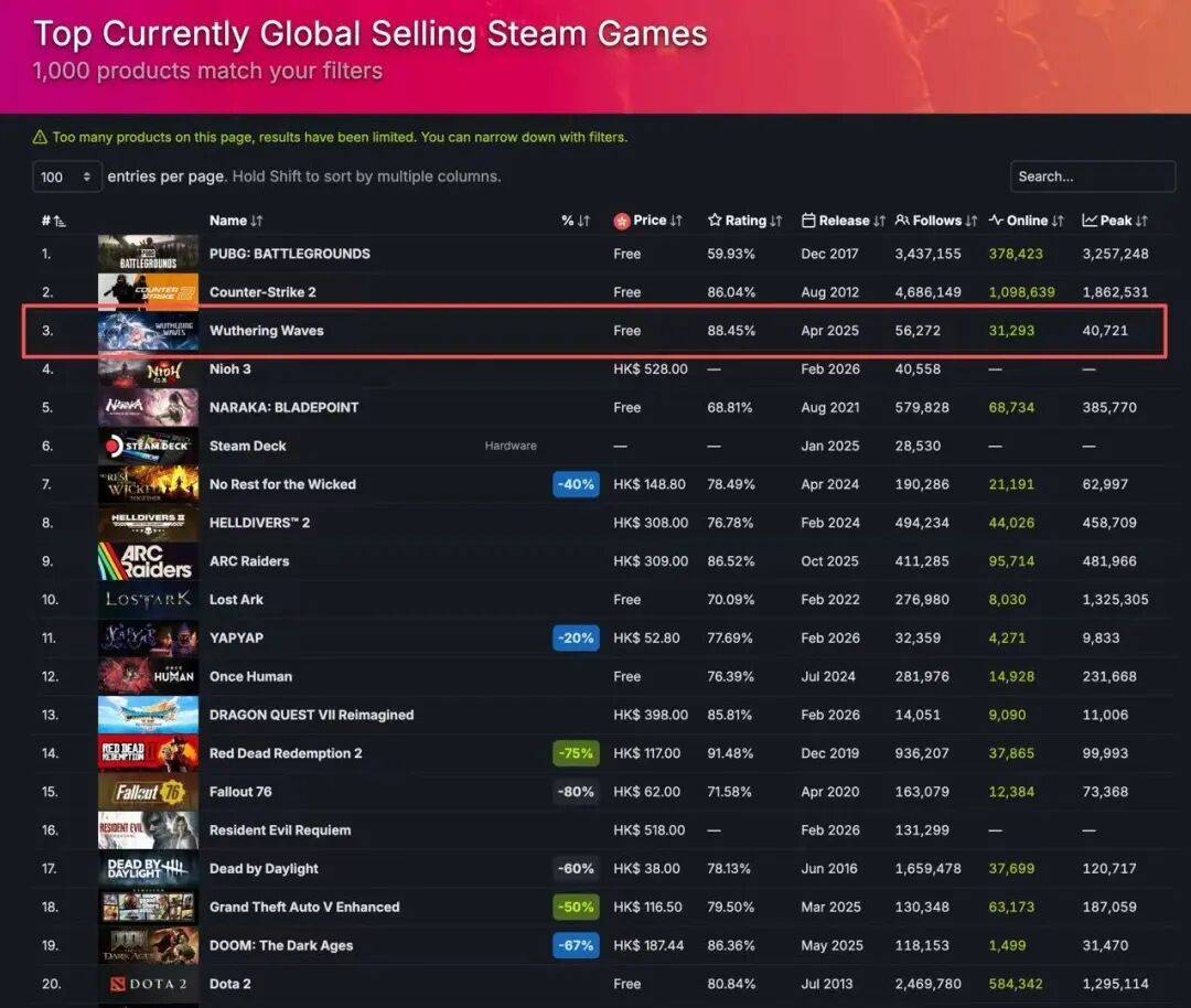 另外,5日傍晚,《鸣潮》进入Steam全球热销榜第3、同步登顶Steam美服热销榜榜首,并创下38121人的在线峰值。
