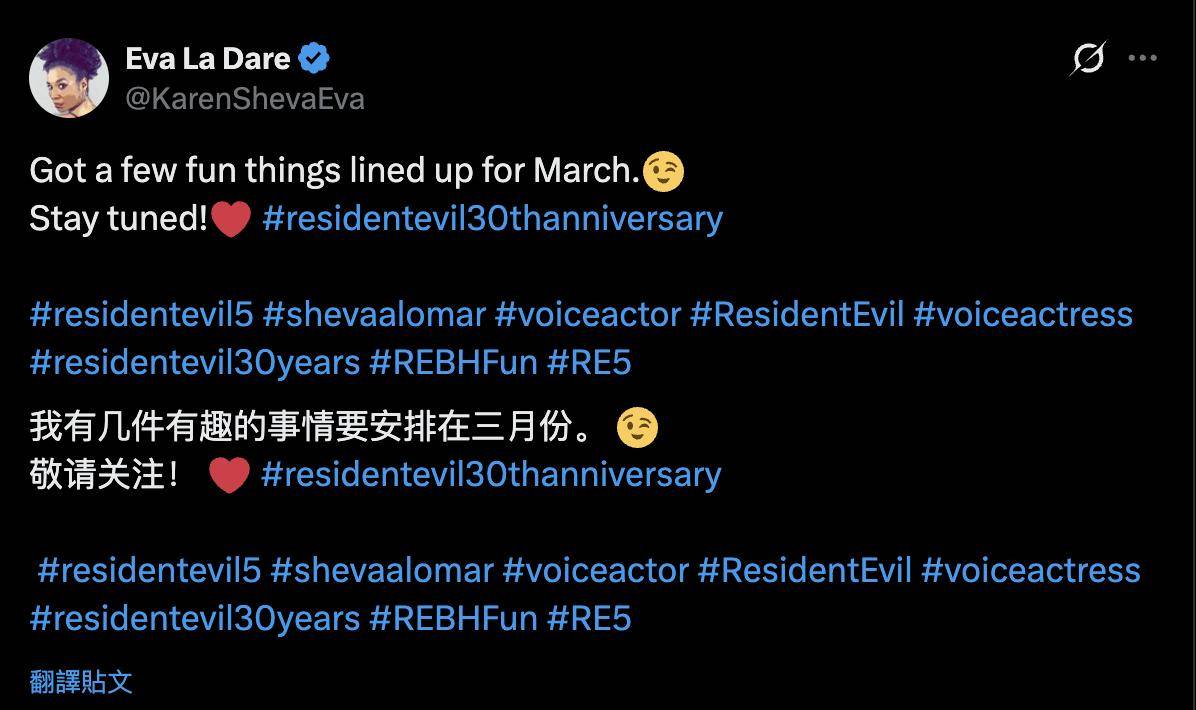 此外,《生化危机 5》谢娃 · 阿洛玛的配音演员 Eva La Dare 上个月在 X 平台发文称:“三月将有一些有趣的事情要发生,敬请期待!”,并在贴文中附上了“#RE5”“#resident evil5”(生化危机 5)标签。
