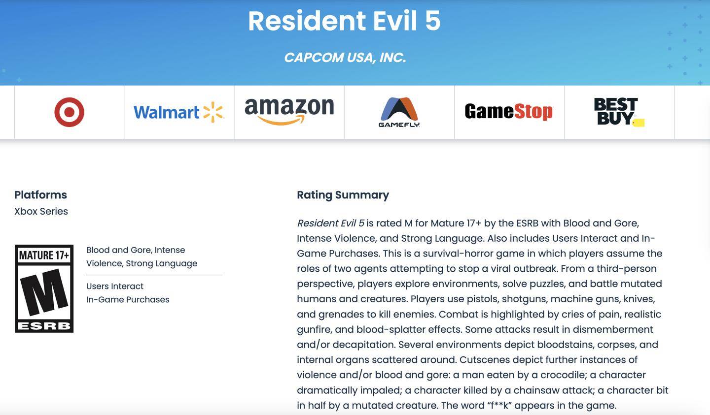 IT之家 2 月 10 日消息,据游戏媒体 Kotaku 今天报道,卡普空《生化危机 5》游戏 Xbox Series 版最近出现在美国分级机构 ESRB(娱乐软件分级委员会)官网。