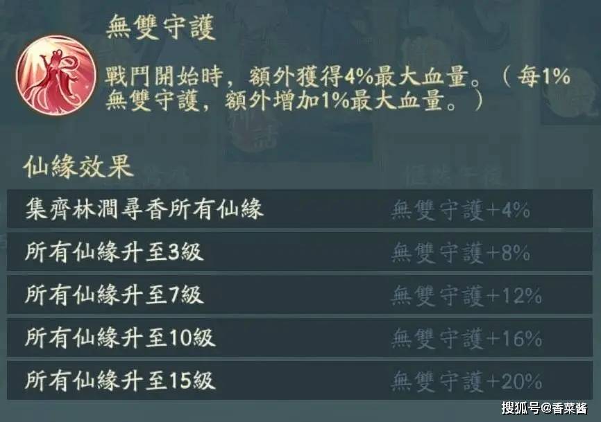 无双守护:战斗开始时,每1%无双守护,额外增加1%最大生命上限,集齐一套1级的仙缘就能开启无双守护。