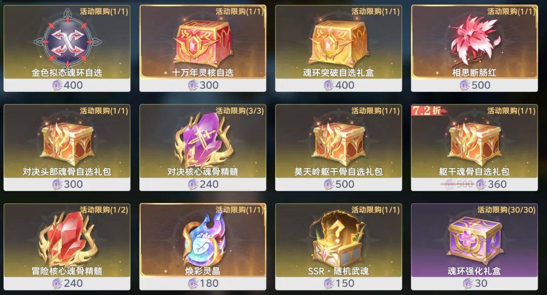 接着还可以考虑一二的就是冒险核心魂骨精髓了,这个给我们的魂骨慢慢升星还是一个比较稳妥的选择,240星神玉大概需要消耗我们75抽限定抽,大家可以综合考量一下,此外还没有泰坦或万妖的朋友也可以看看360星神玉的躯干骨自选礼包,而对于星神玉较为丰富的朋友而言,500星神玉的相思断肠红也是一个可以考虑的兑换选项,其余则基本上没有太高优先级了,最后当然也欢迎大家留言来聊聊自己的看法吧!
