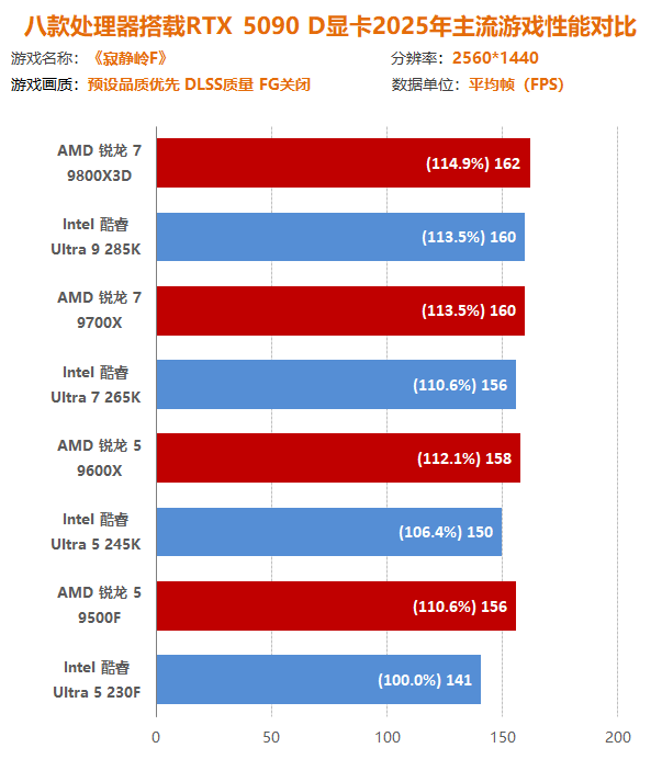 通过本次锐龙7 9800X3D到锐龙5 9500F四款主流/高端的AMD处理器与酷睿Ultra 9 285K到酷睿Ultra 5 230F四款主流/高端的Intel处理器与十二款2025年主流游戏大作交叉对比测试可以发现,在最新一代处理器中,AMD处理器在游戏方面有着得天独厚的优势,不仅可以实现同定位下性能碾压,而且越级吊打也如家常便饭。