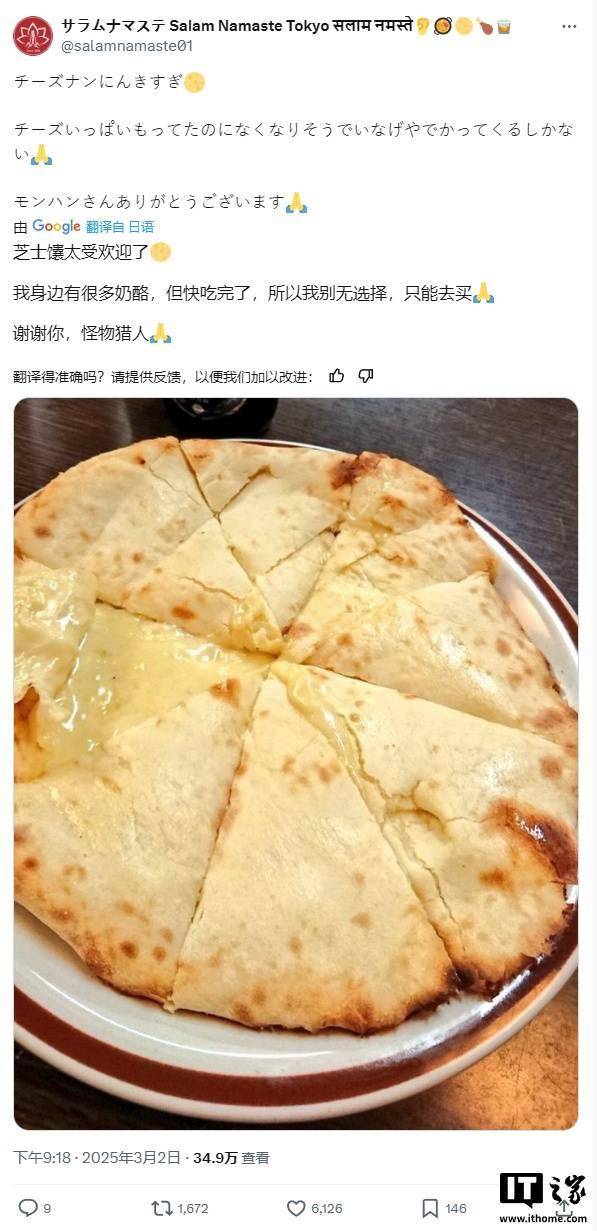 IT之家注意到,东京一家尼泊尔餐厅“萨拉姆纳马斯特”迅速抓住了这股奶酪馕热潮,通过社交媒体宣传并直接提及游戏,以此提升销量。餐厅在推文中表示:“奶酪馕太受欢迎了!尽管我准备了很多奶酪,但还是很快就快卖完了,我不得不去超市补货。感谢《怪物猎人》!”